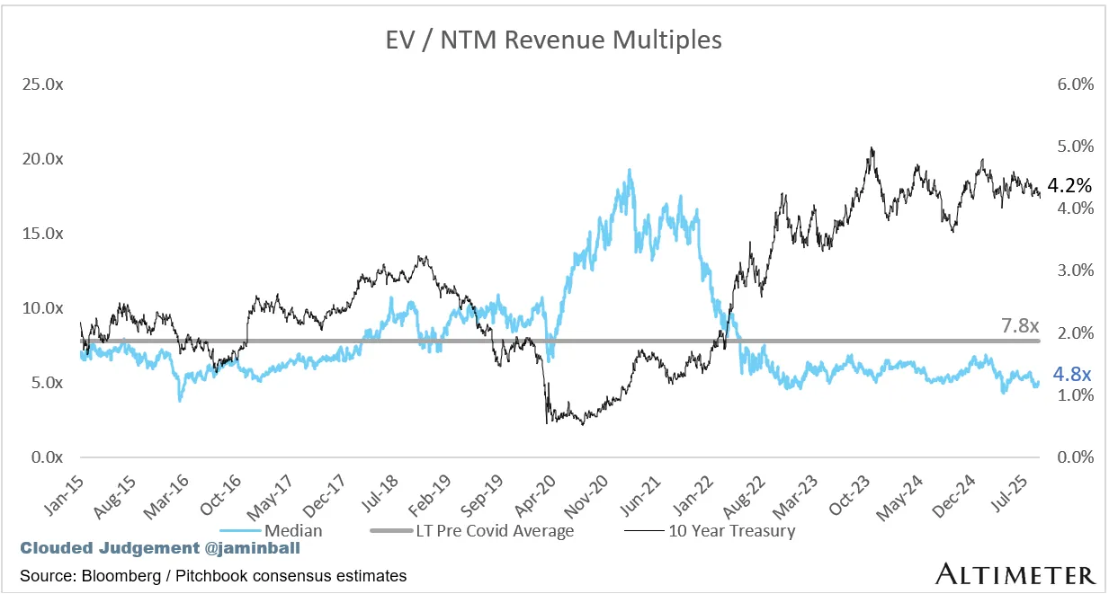 The Valuation Compression: Public market valuations for software companies have compressed dramatically. Companies that once traded at 20-30x revenue multiples are now lucky to get 5-7x. This isn't just a paper loss for founders and investors, it fundamentally changes the math on everything from employee compensation (those options aren't worth what they used to be) to M&A strategies to the viability of growth-at-all-costs approaches.